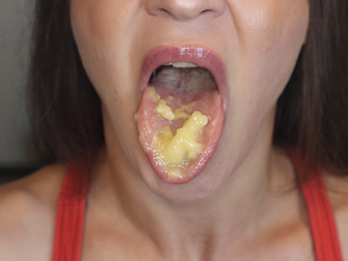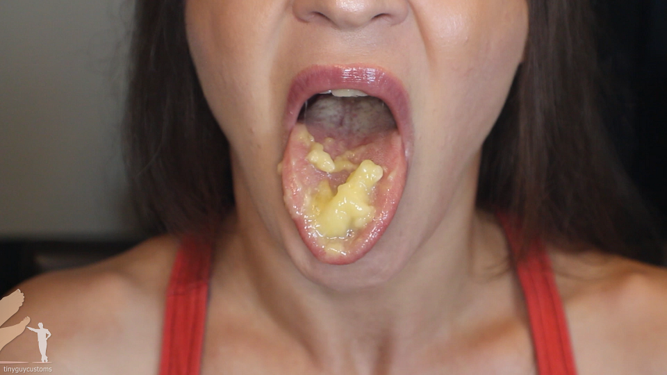 She chomps into the tasty treats and pulverizes them with her powerful teeth. She moves the chunks of smashed up bits to the back of her throat with her sexy tongue and swallows everything down with a gulp. She shows you her empty mouth after swallowing to show you that the morsels of food have travelled down into her hungry belly.