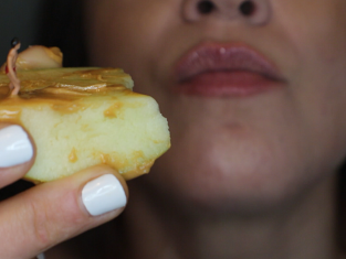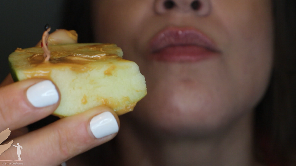 What's this? There's a shrunken man who has found himself on her caramel apple. What a silly place to play... His feet are stuck in the gooey rich caramel as she takes bite after bite getting closer and closer to him. Between bites Cheyenne shows the apple pieces that have been turned into mush by her massive molars. The little man is soon to join her lunch down in her stomach if he doesn't think of something quick...