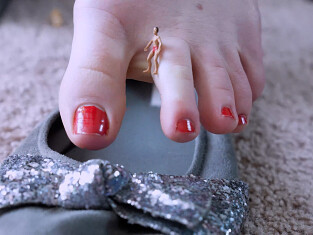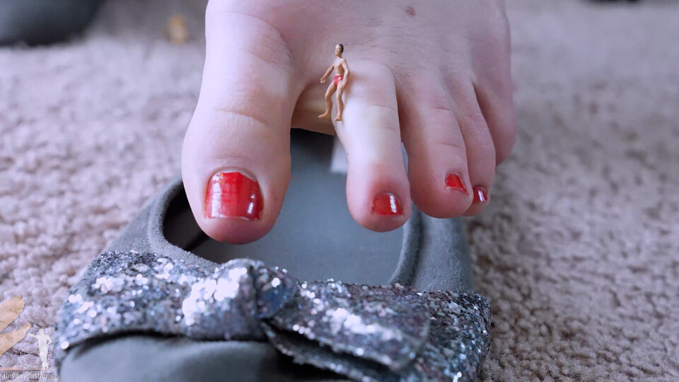 The video opens with the tiny troublemakers stranded on the living room floor. Miss Epiphany arrives home, calling out and wondering where they are. They had planned to show her something, but now they are far too small to get her attention. She walks in, her steps booming as her ballet flats shake the ground beneath them. “Hello? What did you want to show me?” she calls out, glancing around the room. She comes dangerously close to stepping on them, unaware they are right at her feet. Sitting down with a heavy thump, she idly slips her feet in and out of her shoes. The tiny men shout up at her, but their voices are too small to hear. A couple of them make a bold move and run out in front of her, only to be scooped up between her toes and casually dropped into her shoes without her even noticing.