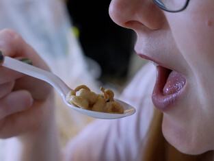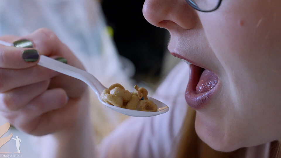 Feeling hungry, Miss Epiphany heads to the kitchen for a snack. Before she starts eating, her favorite song comes on and she begins to dance. Unaware of the tiny man on the floor below, she jumps, stomps, and spins as he runs frantically to avoid her. Her oversized slippers make escape impossible. Eventually, she sits down and notices what she thinks is a bug on the counter. “Ew, gross,” she says, flicking him to the floor. He looks up and tries to tell her he is not a bug but her stepson’s friend, but she does not hear him and casually stomps him out. She returns to her snack, pouring herself a bowl of cereal. Another tiny figure is on the counter, trying to get her attention, but she only notices the mess around him. “What a mess I’ve made,” she mutters, scooping him up along with the cereal and dropping him into the bowl. He struggles to swim through the milk and cereal pieces, but before he can escape, he is scooped up in a spoonful. He tries to cry out again, but she brings the spoon to her mouth and swallows him without a second thought.