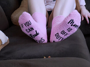 After a while, Miss Epiphany heads to the bedroom to relax. Two of the tiny men find themselves on the bed near her feet. Her pink fuzzy socks look climbable, so they begin their ascent, hoping to finally get her attention. The climb is difficult, and just as they reach the tops of her toes, she shifts her feet, sending them tumbling down to the floor. Moments later, she stands, and as her socked feet come down, the tiny men meet their end beneath them.