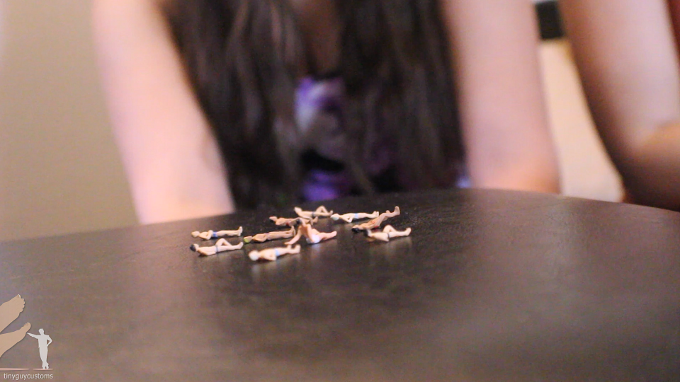They return to the group and deliver the bad news. The two giantess women explain that they cannot let the rest of them go. Gigi slides one down in front of her and slams her fist down obliterating him in an instant. Rae is delighted and wants to try it too. The tiny group are now in a panic but any attempts to run are futile.