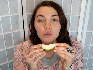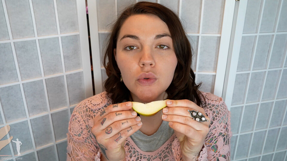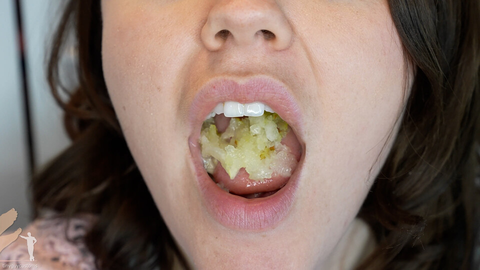 Get a close-up view of this beautiful woman consuming her fruits. Watch her bite, chomp, and mash her food into mush. behold her slurping down the sludge she creates with her mighty teeth. She shows you what it would be like to be her food. And you can't help but wonder what it would be like can you?