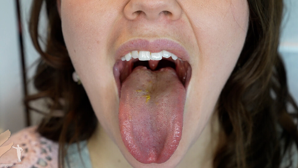 Imagine yourself shrunken down clinging to a piece of fruit as she devours it or tiny and caught inside her mouth trying to escape her greedy lips and tongue. Would you try to escape? Or would you just let it happen?