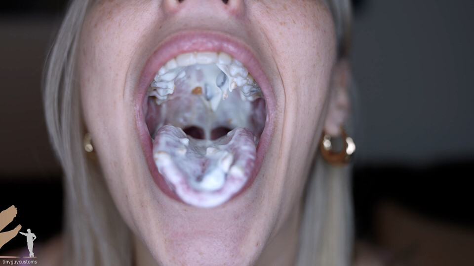 You agreed to be shrunken down by Goddess Harleen and to be swallowed with her yummy yogurt treat. It has always been your deepest, darkest fantasy to be slurped down with a giant woman's gooey food. You want to feel what it would be like to be rolled around in her giant mouth and tossed around by her powerful tongue. You will be slowly passed back towards her waiting esophagus and after she's had her fun, she'll gulp you down into her greedy belly.
