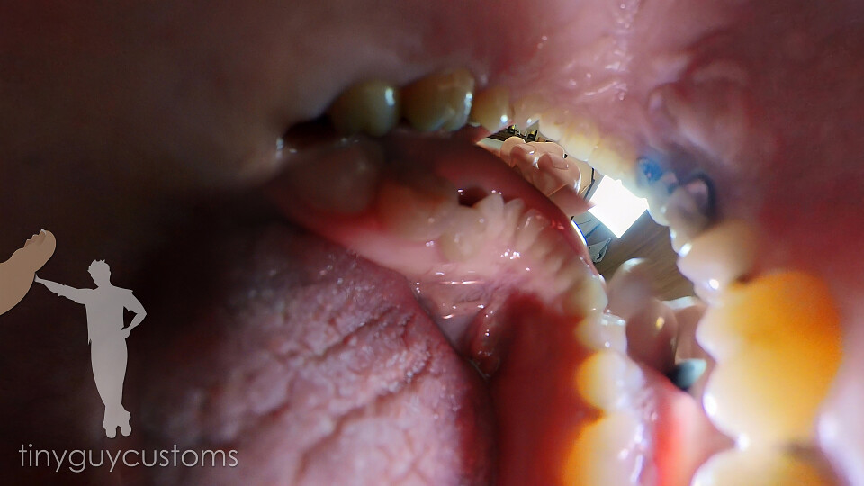 She slowly brings you closer once more and opens wide. You can see everything inside her mouth now. You lay down on her tongue and watch her uvula dance in the back of her throat. Then you turn towards the back of her teeth and let her tongue slowly pull you backwards down into the darkness.