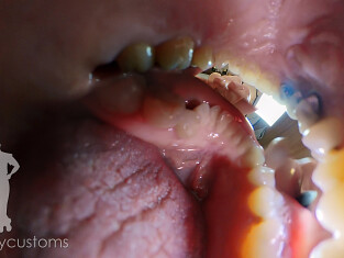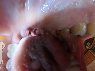 This video has light music and voice echo/deepening. For the last inside portion of this inside mouth shot we used an additional light to try and capture more of the inside of Harleen's mouth.
